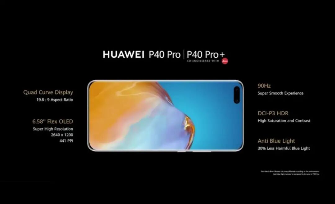 屏幕规格上,P40 用的是 6.1 英寸屏幕,分辨率为 2340 x 1080;P40 Pro 和 P40 Pro+ 则是 6.58 英寸的 OLED 屏,分辨率为 2640 x 1200,支持 90Hz 刷新率显示。