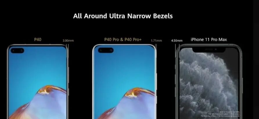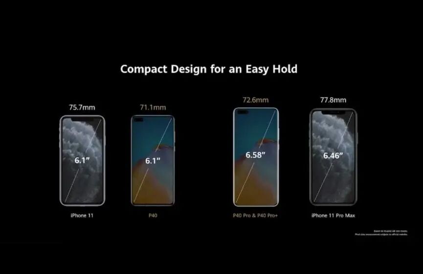 四曲面屏给 P40 Pro 和 P40 Pro+ 带来了非常高的屏占比,虽然华为没有在发布会上公布具体数据,但分别给出了 P40 Pro 屏幕 72.6mm 和 P40 屏幕 71.1mm 的对角线长度,相比 iPhone 11 Pro 和 iPhone 11 Pro Max 在机身尺寸和边框宽度上还要更小一些。