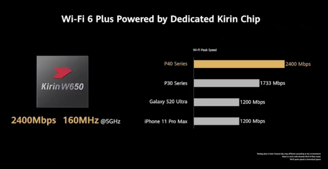 华为P40搭载麒麟990 5G处理器,内部集成5G,支持NSA和SA双模5G,频段覆盖n1/n3/n41(2515M-2690MHz)/n77/n78/n79,全系支持双卡双待、eSIM,支持WiFi 6+,下行速率可达2400Mbps。