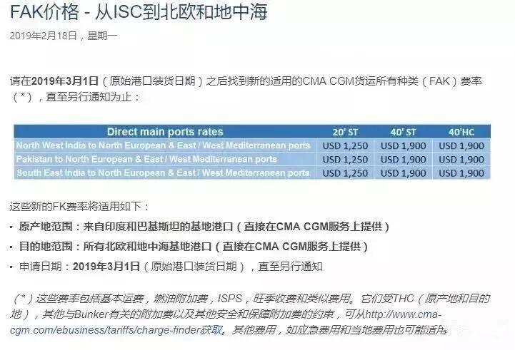 2019年3月1日起,自印度和巴基斯坦港口至所有北欧和地中海港口所有种类费率收取如下: