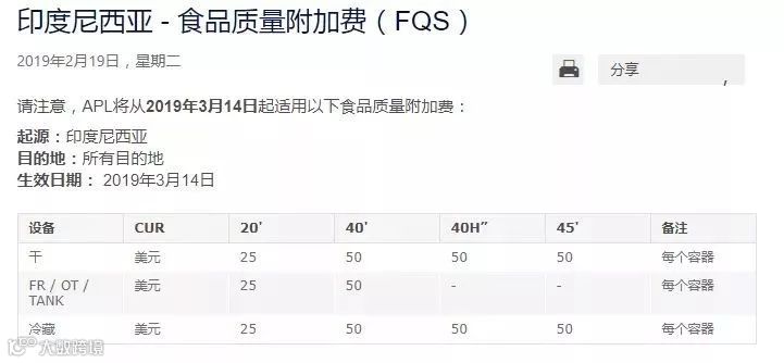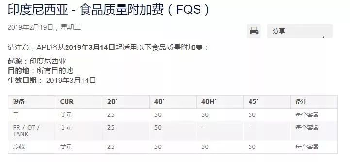 APL将从2019年3月14日起收取自印度尼西亚去往各地的食品质量附加费,费用如下: