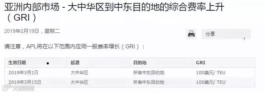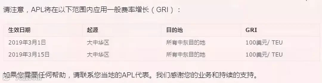 大中华区到中东目的地的综合费率(GRI)上升调整如下: