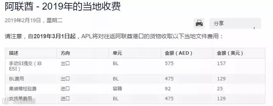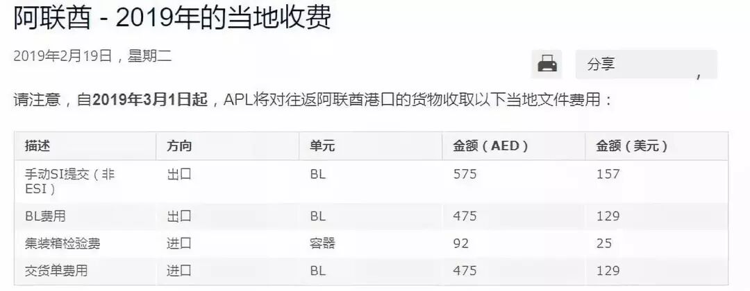 自2019年3月1日起,APL往返阿联酋港口货物收取费用如下: