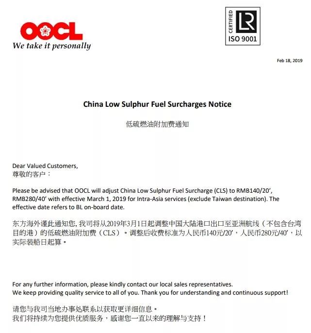 OOCL将从2019年3月1日起调整中国大陆港口出口至亚洲航线(不包含台湾目的港)的低硫燃油附加费(CLS)。