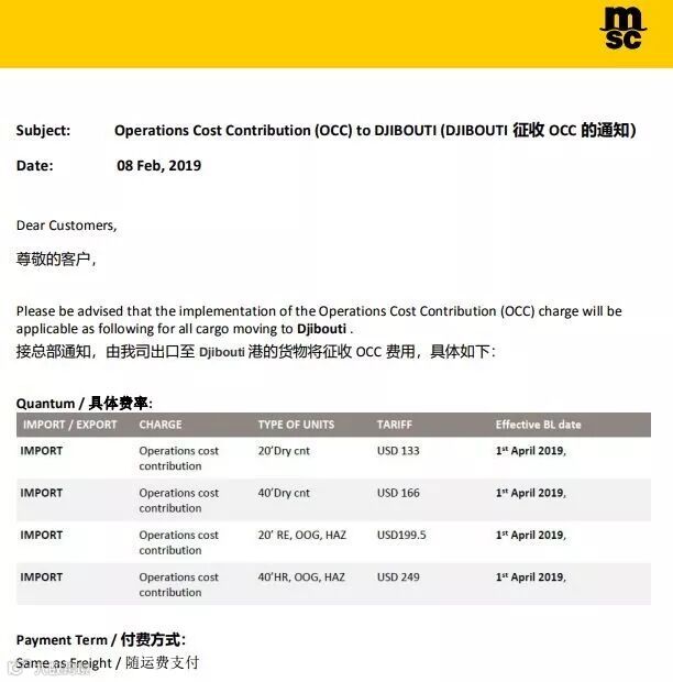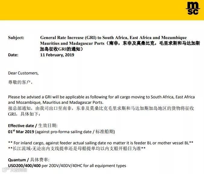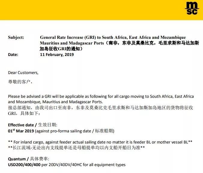 MSC出口至南非,东非及莫桑比克毛里求斯和马达加斯加岛地区的货物将征收GRI。具体通知如下: