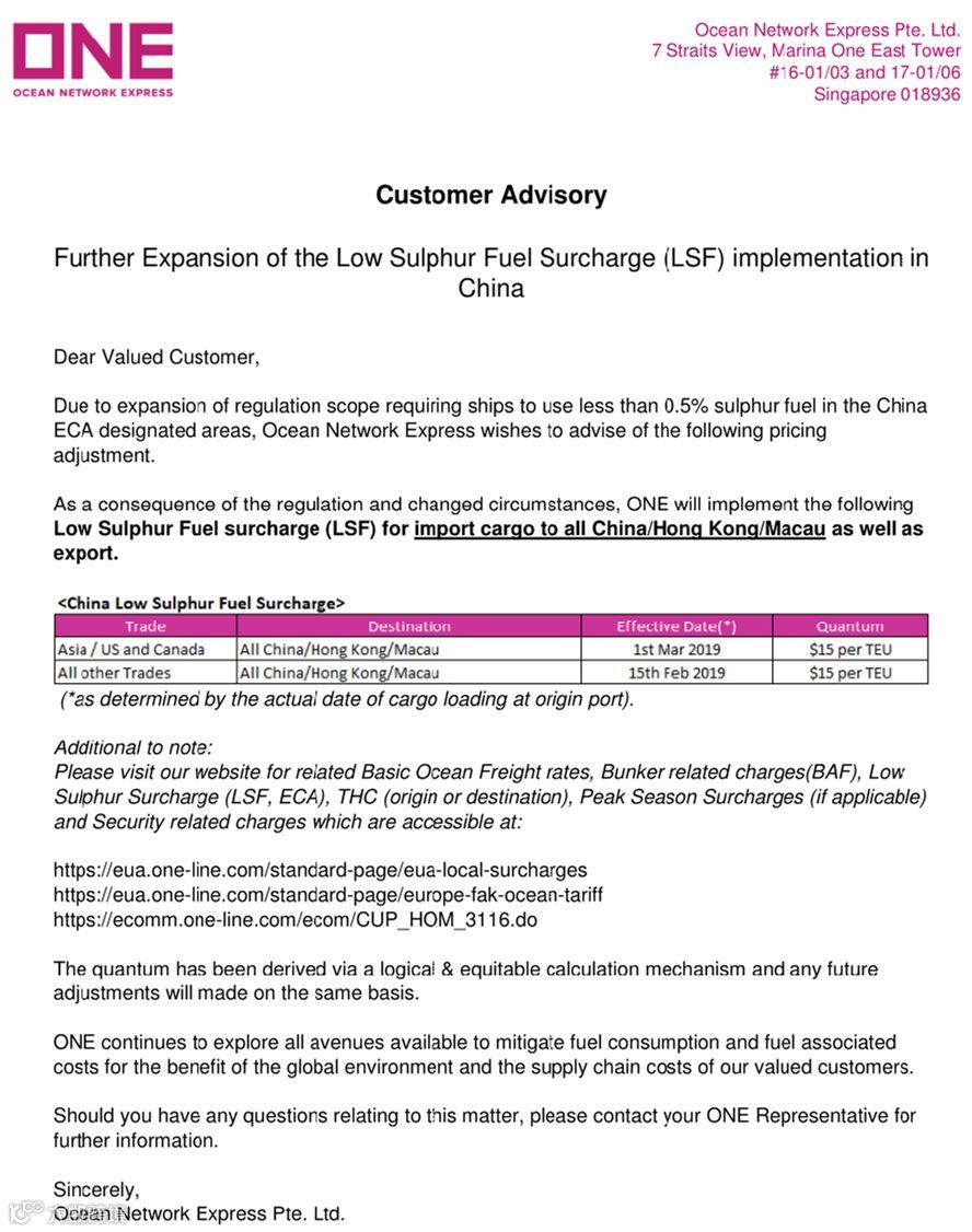 由于监管范围的扩大,要求船舶在中国ECA指定区域使用低于0.5%的硫燃料,ONE公司计划做出以下调整。从2月15日及3月1日两个时间节点起,ONE公司将陆续对出口至中国(包括香港、澳门)货物收取低硫燃油附加费(LSF),具体标准为:
