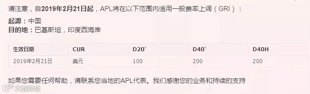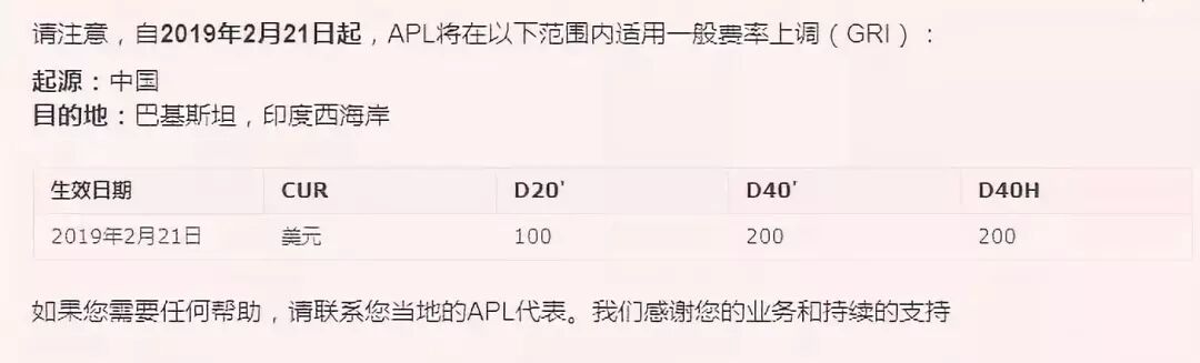 从2月21日起,美国总统轮船(APL)将收取中国至巴基斯坦、印度西海岸综合费率上涨附加费(GRI),标准为:100美元/20英尺集装箱、200美元/40英尺集装箱、200美元/40英尺高箱。