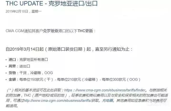 自2019年3月14日起,克罗地亚港口THC费用收取如下:
