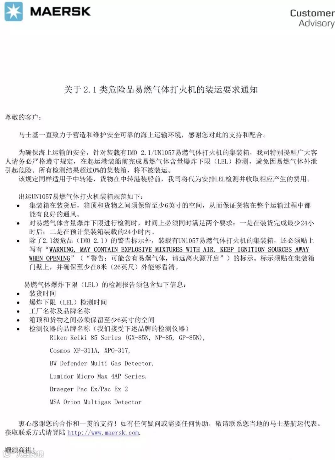 马士基为确保海上运输的安全,针对装载有IMO2./UN1057易燃气体打火机的集装箱,特别提醒广大客人请务必严格遵守规定,在起运港装船前完成易燃气体含量爆炸下限(LEL)检测,避免因易燃气体外泄引起危险。所有检测结果超过0%的集装箱,将不被装运。该规定同样适用于中转港,货物在中转港装船前,我司将代为安排LEL检测并收取相应产生的费用。