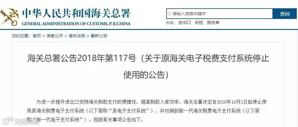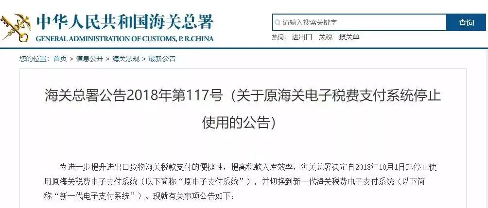 为进一步提升进出口货物海关税款支付的便捷性,提高税款入库效率,海关总署决定自2018年10月1日起停止使用原海关税费电子支付系统(以下简称“原电子支付系统”),并切换到新一代海关税费电子支付系统(以下简称“新一代电子支付系统”)。现就有关事项公告如下: