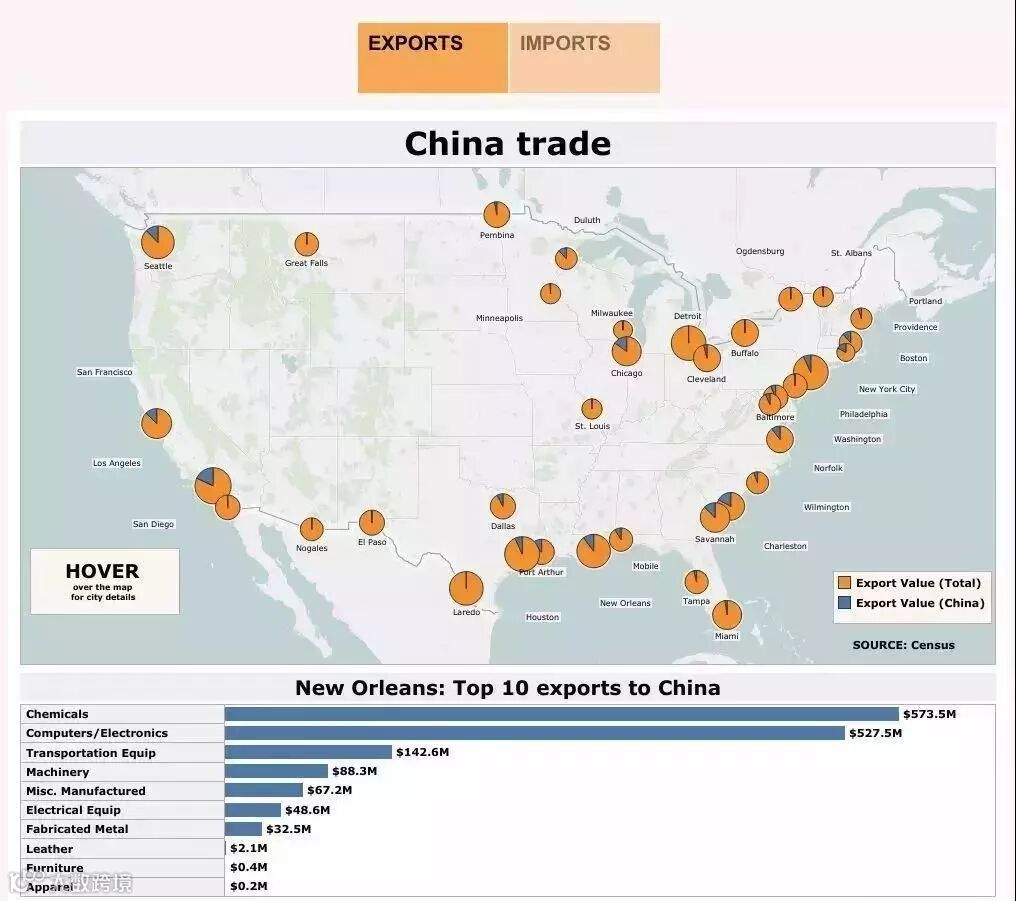 根据美国港口管理部门的数据,今年前5个月,洛杉矶/长滩港、芝加哥港和纽约港分别处理了价值790亿美元、230亿美元和200亿美元的中国商品,这三大港口处理的中国货物最多,感受到的压力也是最大的。另据统计,在美国前20大港口中,与中国贸易的比例超过25%的港口共有16个。
