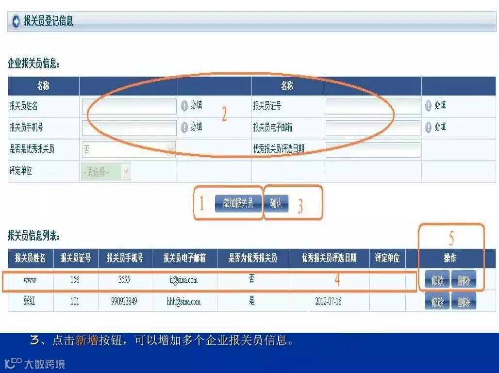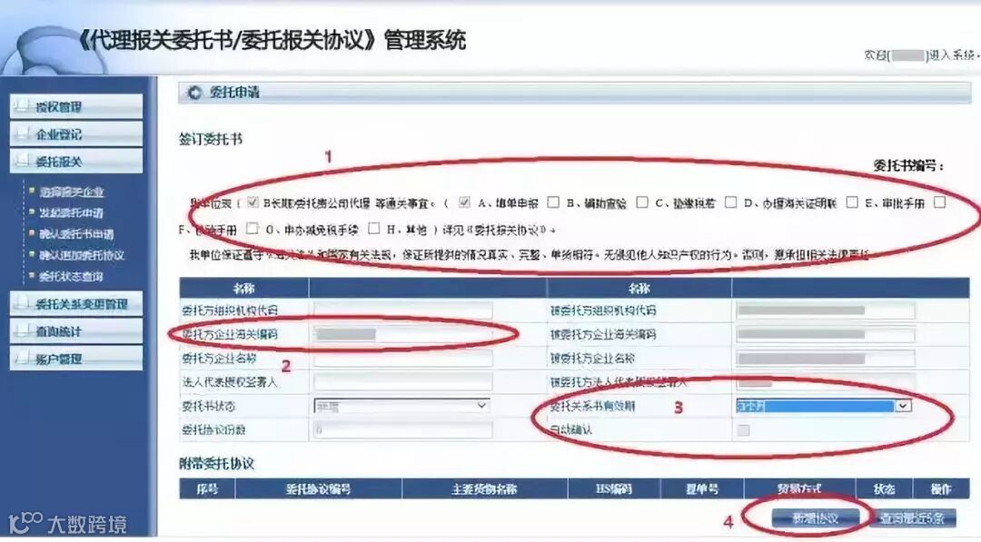 2、选择报关委托有效期(最长12个月)(详见图2中的序号“3”)(请注意,报关企业无法勾选“自动确认”),点击“新增协议”(详见图2中的序号“4”),填写具体的委托协议内容。