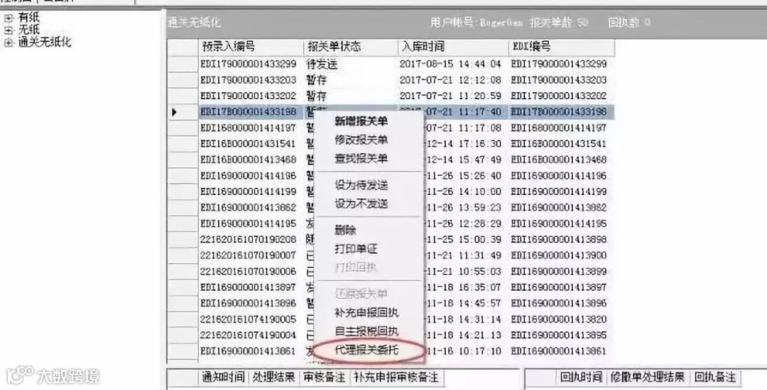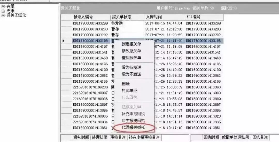(1)选择一票暂存状态的单证,右键选择进入录入代理报关委托界面(注:目前必须是暂存状态的单证):