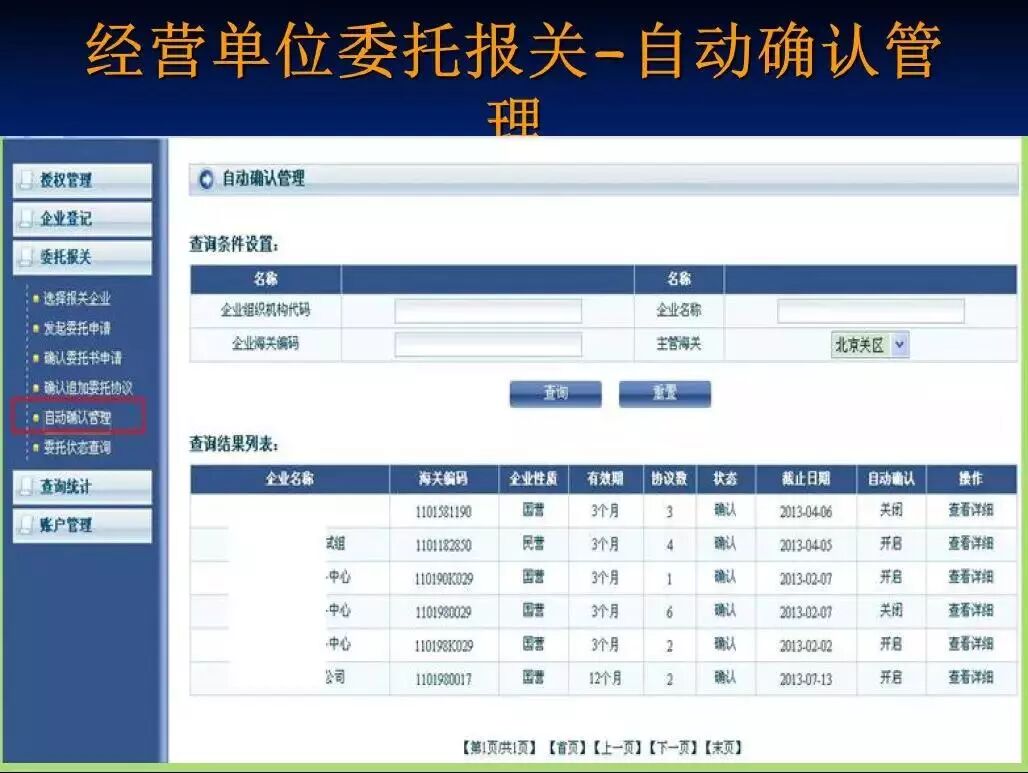 5、报关企业第一次发起的委托,是无法勾选“自动确认”的,如需执行该操作,可请客户(即收发货人)用户登录系统,接收委托后,在“委托报关”栏目下的“自动确认管理”中进行修改。