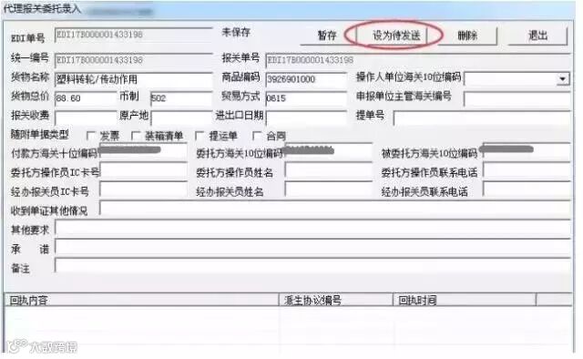 (2)界面会将已录入的报关单中调用相同字段的内容进行填充,填写必填项:“申报单位主管海关编号”,录入完成后设为待发送: