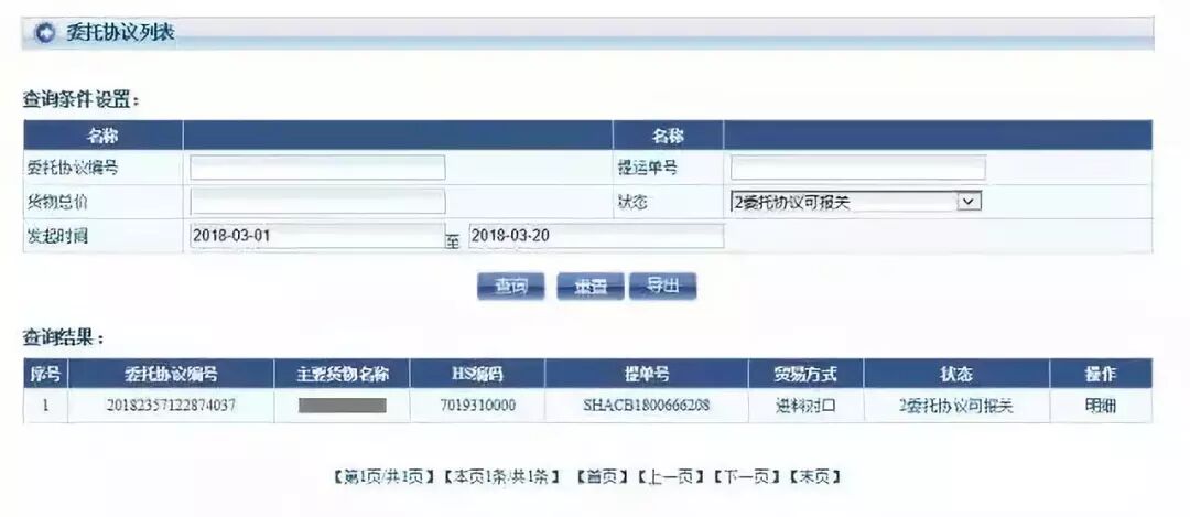 委托报关—>委托状态查询—>录入十位编码查询详情—>按所需状态查询—>时间跨度—>导出