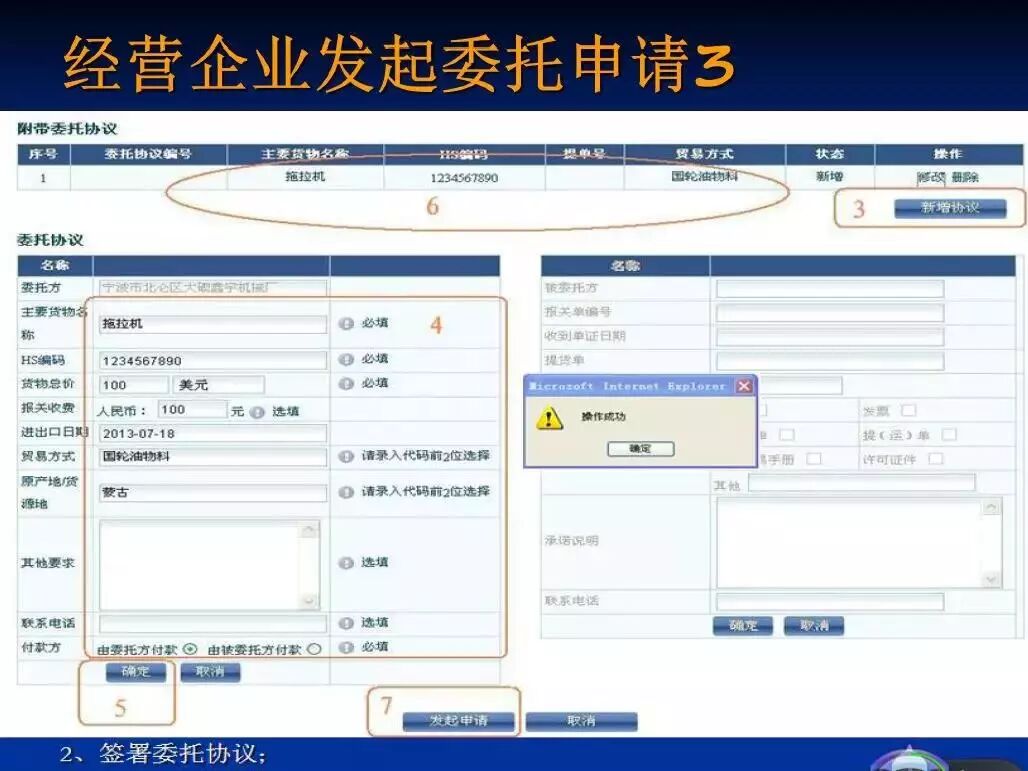 4、填写完成后,保存协议,点击【发起申请】(详见下图中的序号“2”),完成本次委托的申请动作,系统弹出提示“操作成功”。