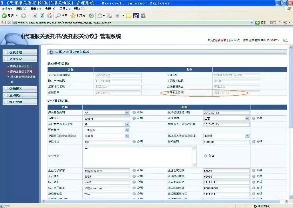 如已超期,应进入“报关企业登记”下的“报关企业信息变更”子菜单进行变更并提交,审批成功后即为完成延期。