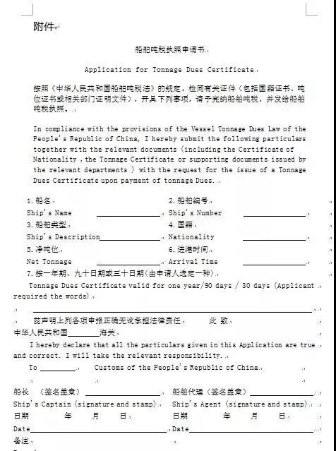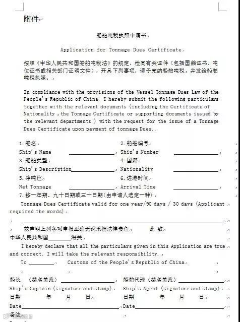 四、应税船舶负责人应在应税船舶抵港申报纳税时,如实填写《船舶吨税执照申请书》(见附件),同时应当交验如下证明文件: