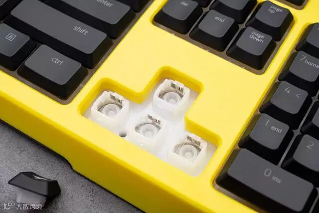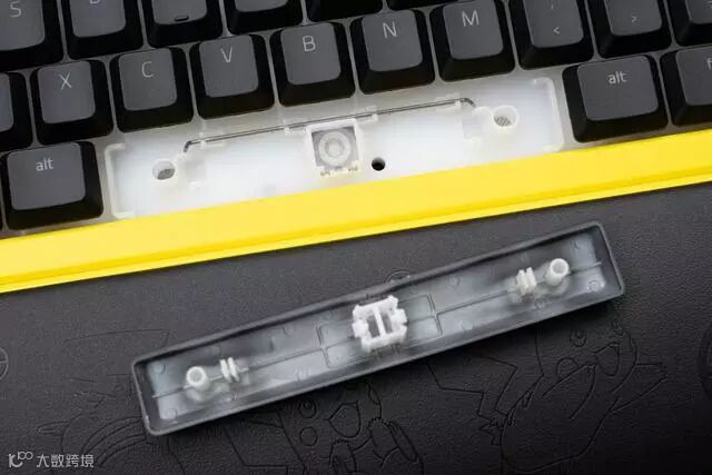 取下空格键,可以看见空格键采用卡扣与平衡杆暗扣组合。