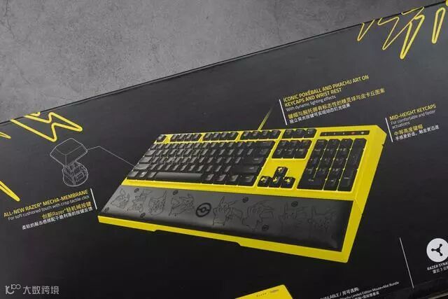 皮卡丘限定款键盘的包装是黑+黄的配色设计,非常醒目的就是上面的黄色十万伏特闪电!键盘包装保留了雷蛇经典的窗口设计,可以直接触控键盘实物,体验一下轴的上手手感。