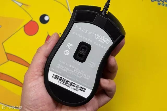 鼠标的底部可以看见采用了两块大脚贴,顺滑度很高,中间就是6400DPI的光学传感器,还能看见贴纸上面标注了这款是皮卡丘限定款和鼠标的性能参数。
