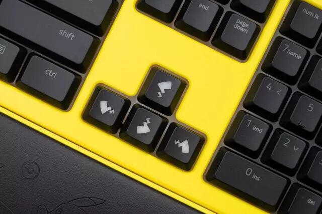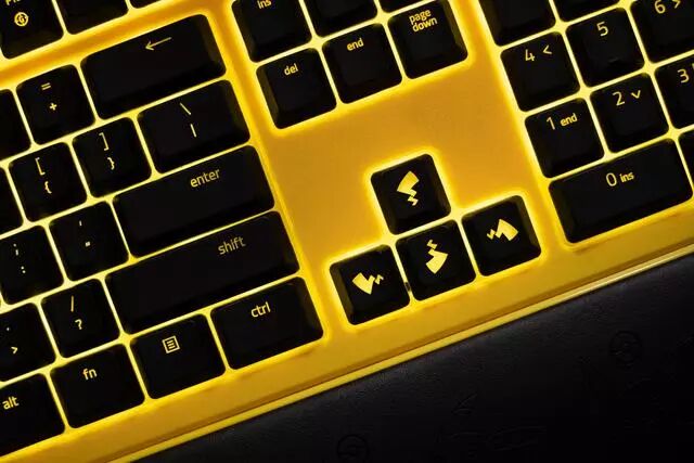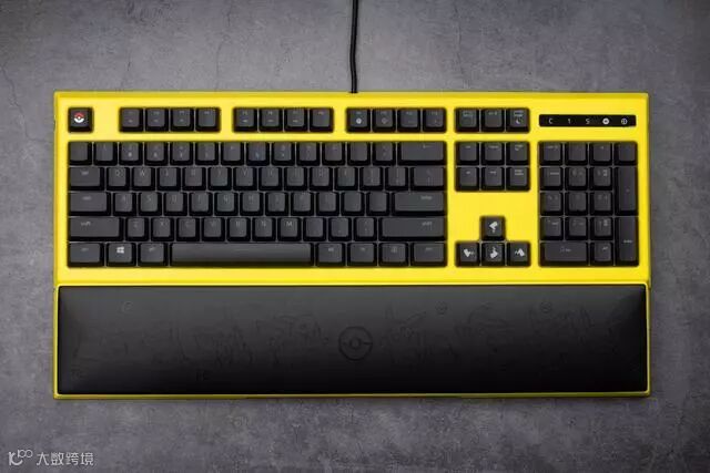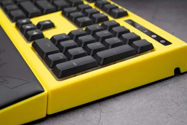 皮卡丘限定款键盘使用的是104键配列,外观设计很醒目:黄+黑配色组合,也突显了皮卡丘主题。