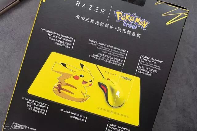 皮卡丘限定款鼠标+皮卡丘限定款鼠标垫是捆绑套装组合,包装设计的配色同样与键盘一样是黑+黄,上面带有皮卡丘涂装+黄色十万伏特闪电涂鸦。