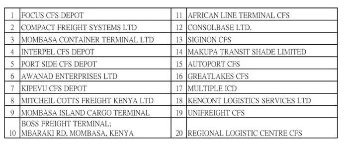 由于肯尼亚政府的突然行动,所有到肯尼亚蒙巴萨(Mombasa)的当地货载,若没有在提单转运条款栏位(即我司提单第10栏)显示下面20个堆场中的任意一个,肯尼亚主管部门将强制把货载由新的SGR铁路转运到距离蒙巴萨(Mombasa) 600公里外的内罗毕(Nairobi)的 Embakasi堆场,费用由收货人承担。