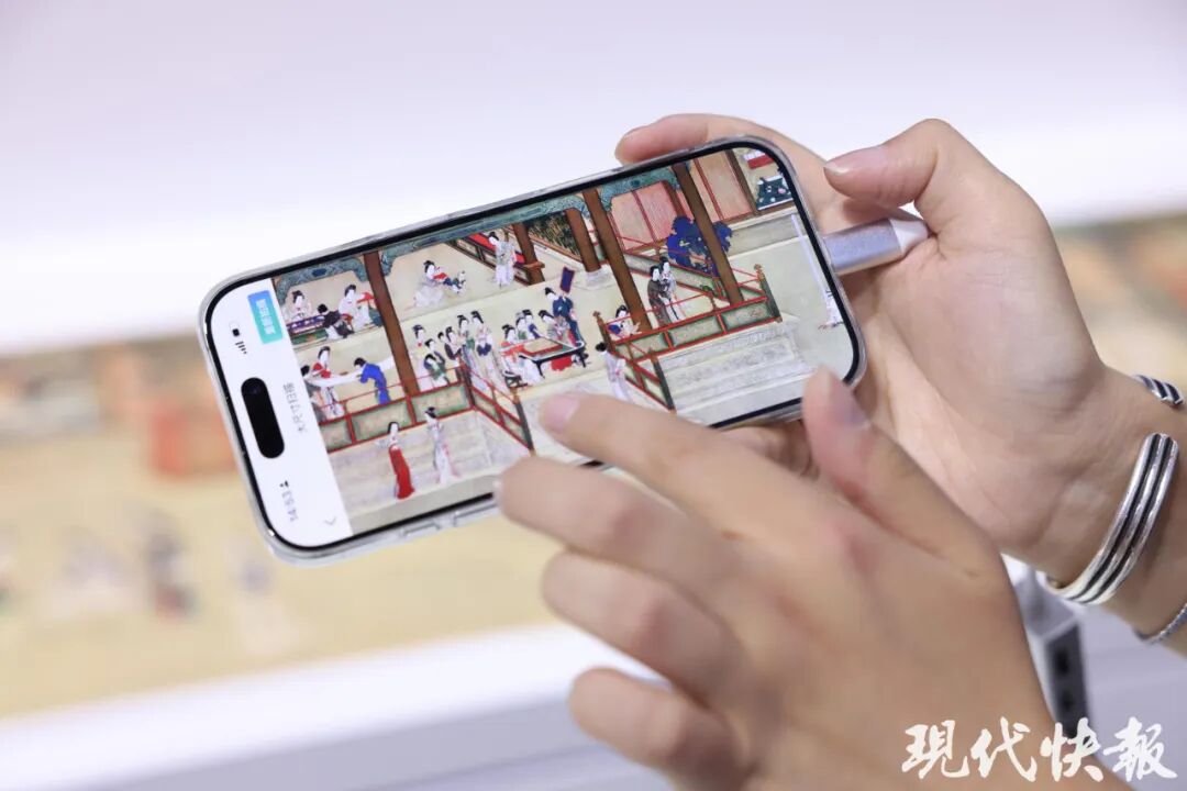 除了令人震撼的《坤舆万国全图》,参观者还能亲身体验明代绘画大师仇英的传世之作《汉宫春晓图》的数字化扫描过程。观众只需手持手机缓缓移动录制,短短数秒后,一幅细节饱满的高清数字长卷便跃然屏上,连仕女衣饰的织锦纹样、屏风上的山水笔触都清晰可辨。