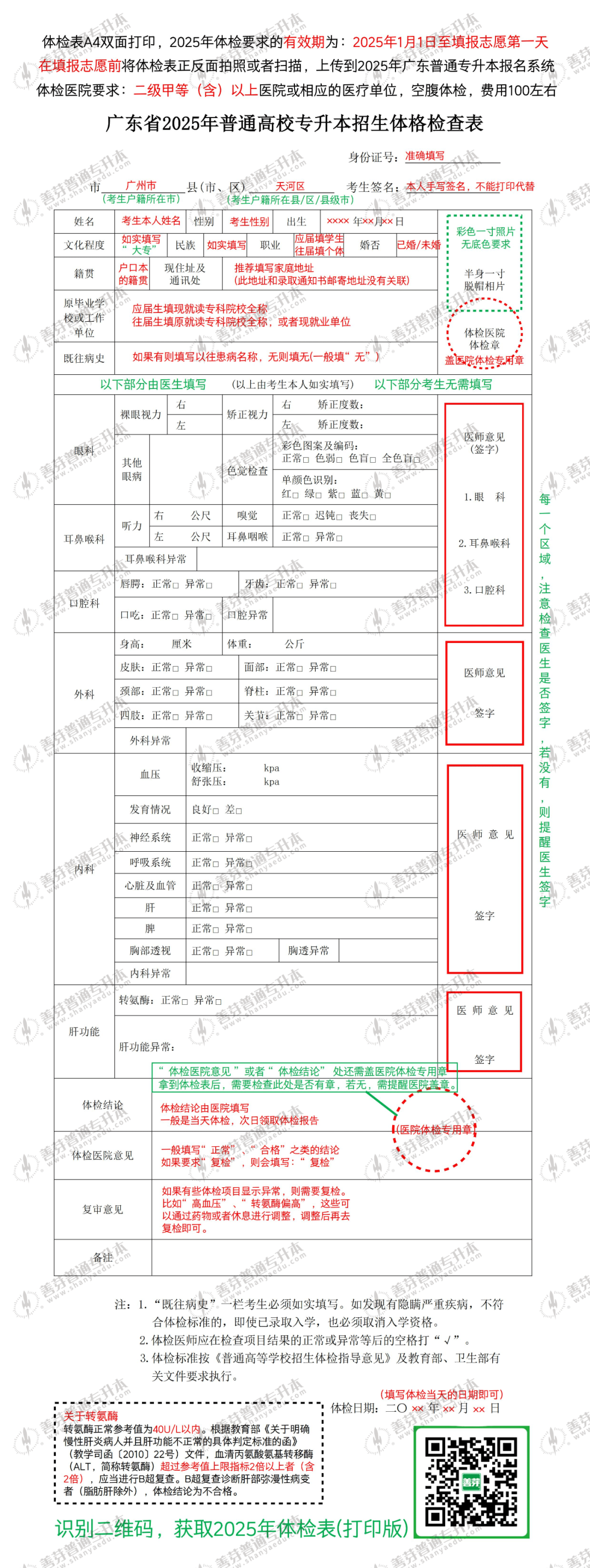 根据《广东省2025年普通专升本招生工作规定》,考生须依据《广东省2025年普通高校专升本招生体格检查表》(附件6)的规定,自行前往二级甲等(含)以上医院或相应的医疗单位进行体检,填报志愿开始前将体检结果上传至报名系统中(体检表有效期:2025年1月1日至填报志愿第一天)。
