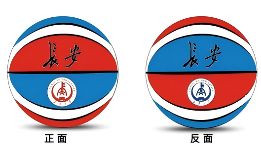 设计理念:结合校园篮球热潮,以校徽红、白、蓝配色及“长安”字体为灵感,打造具学校特色的篮球。