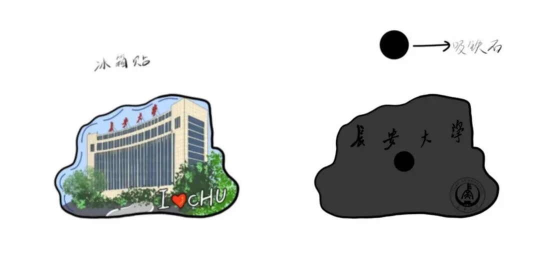 设计理念:冰箱贴正面取学校标志性建筑配“I ♥CHU”表热爱,背面印校名、校徽并融入吸铁石,兼具装饰与实用,留存校园记忆。