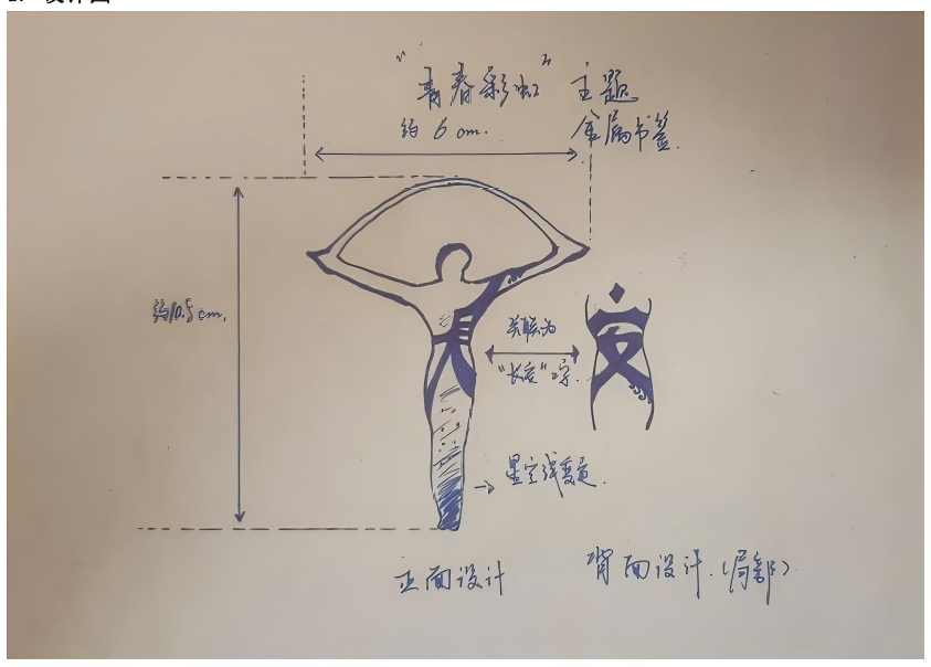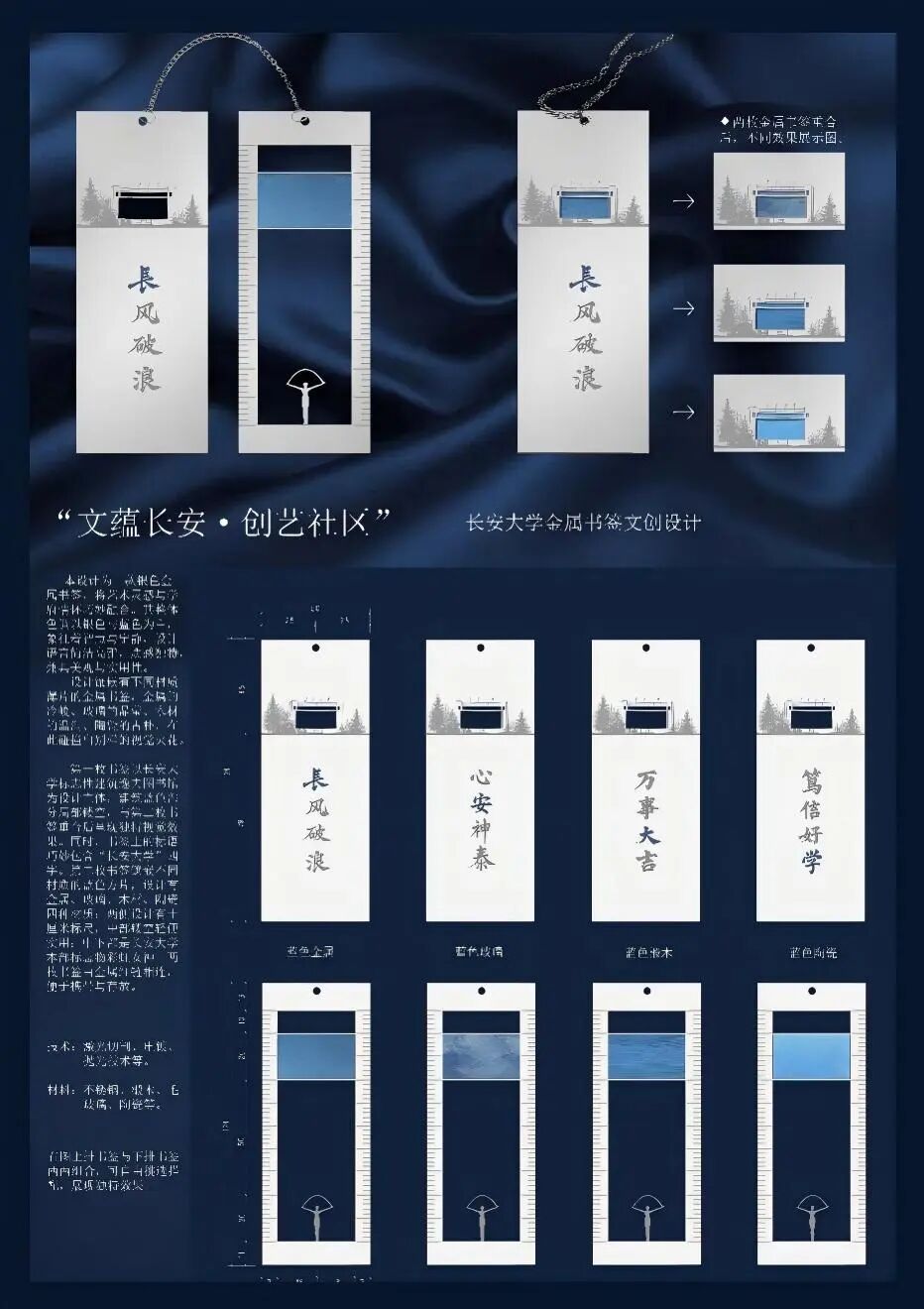 设计理念:以长安大学为核心,银蓝配色象征智慧宁静,选不锈钢等材质,激光切割工艺,两枚书签相连,含图书馆等元素。