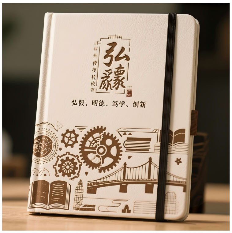 设计理念:以工科特色与校园文化为核心,提取校门、桥梁等元素,设主题章节页,用UV印刷、烫金工艺,具实用与传播功能。