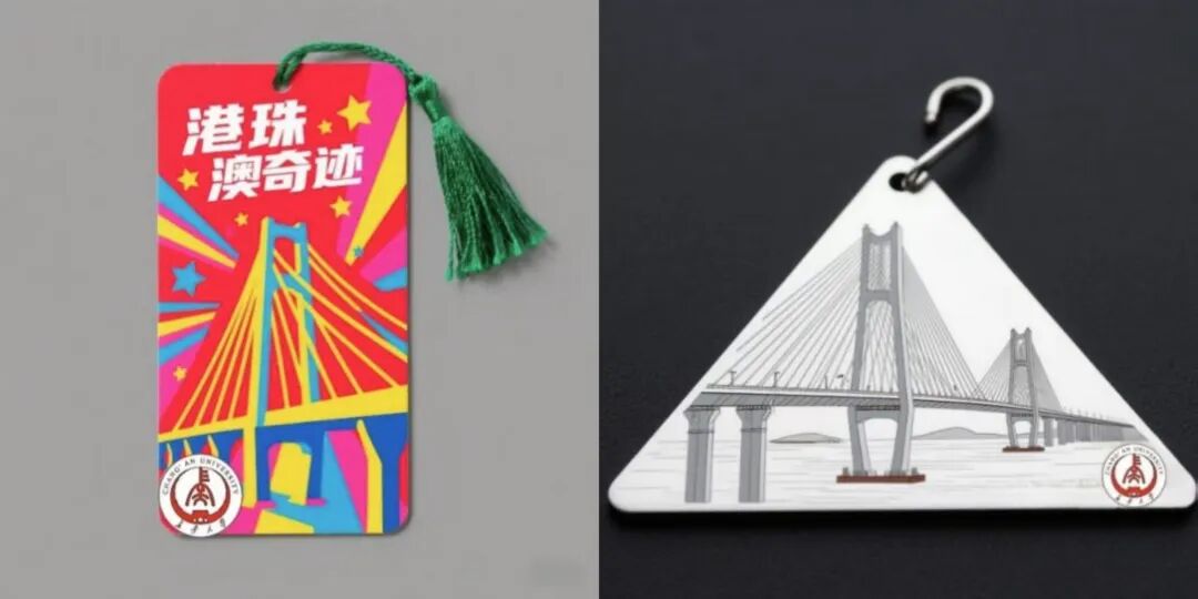 第一款:红底配黄蓝几何桥梁、“港珠澳奇迹”文字及星星,缀绿色流苏,现代风兼具纪念性。