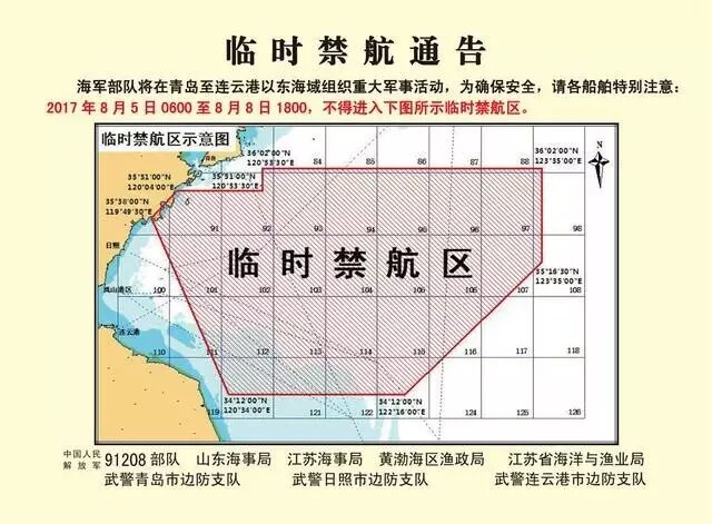 军地联合发布《临时禁航通告》:海军部队将在青岛至连云港以东海域组织重大军事活动。为确保安全,请各船舶特别注意:2017年8月5日0600至8月8日1800,不得进入上图所示临时禁航区,含83-98、100-108、111-117号、119-124号渔区。
