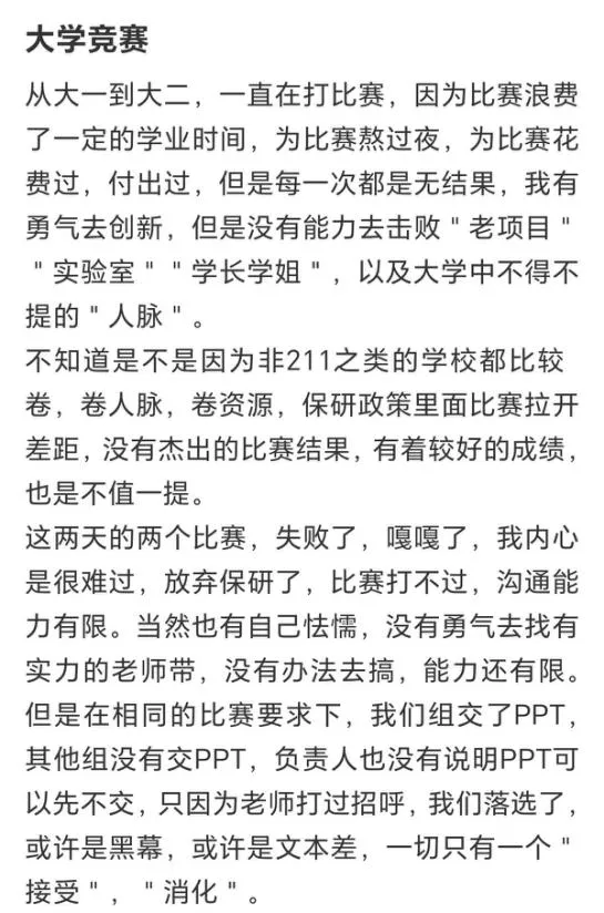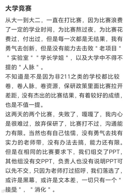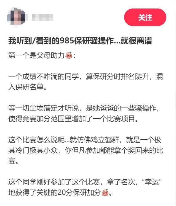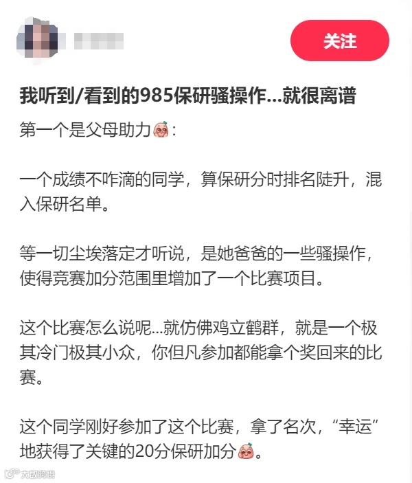 “一个成绩不咋滴的同学,算保研分时排名陡升,混入保研名单。等一切尘埃落定才听说,是她爸爸的一些骚操作,使得竞赛加分范围里增加了一个比赛项目。这个同学刚好参加了这个比赛,'幸运'地获得了关键的20分保研加分。”
