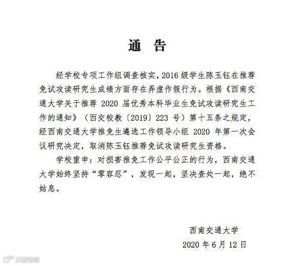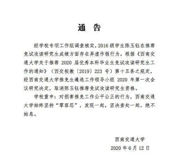 高校在西南交通大学陈玉钰事件发生后,也纷纷发声“对损害推免工作公平公正的行为,高校始终坚持“零容忍”,发现一起,坚决查处一起,绝不姑息。”