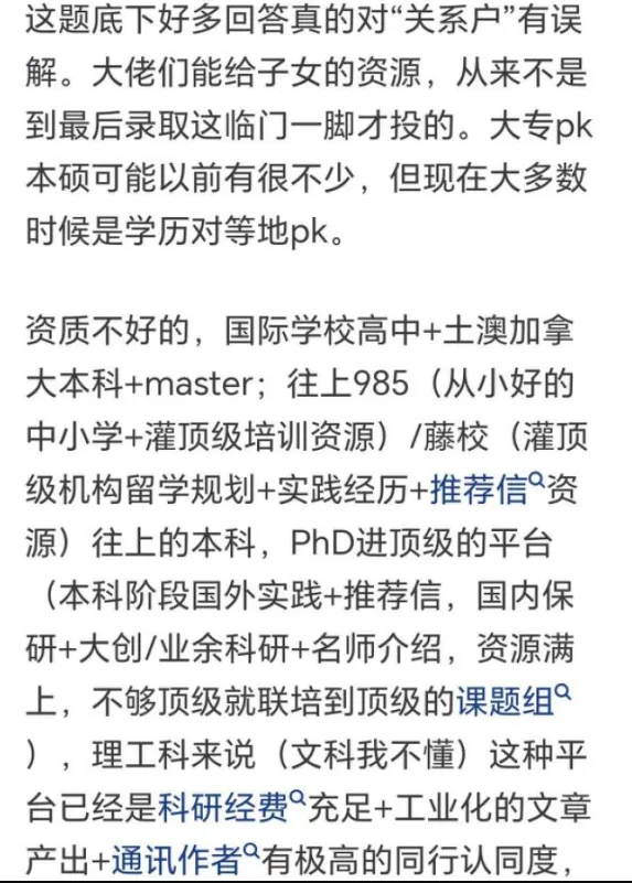 在论文方面,具有科研背景家庭的同学也更容易在大佬的指导下拿出高质量论文,甚至直接由教授父母的研究生为其量身打造作品,实现“大二出专利”“大三发c”的成果。