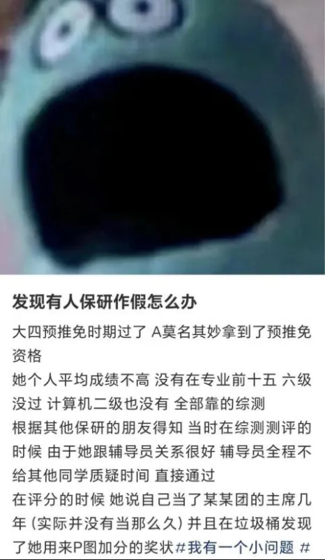 有人凭借和辅导员关系很好,靠着“p图的虚假成绩”成功挤进保研序列,而辅导员“全程不给其他同学的质疑时间,直接通过。”