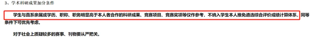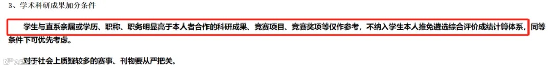 也有院校对学术科研成果加分的条件进行了限制,明确“学生与直系亲属或学历、职称、职务明显高于本人者合作的科研成果、竞赛项目、竞赛奖项等仅作参考,不纳入学生本人推免遴选综合评价成绩计算体系。对于社会上质疑较多的赛事。刊物要从严把关。”