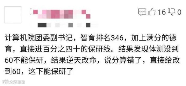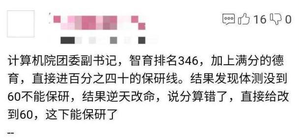 某校计算机学院团委副书记在保研评定阶段发现“体测没到60不能保研”“结果逆天改命,说分算错了,直接给改到60,成功保研”。