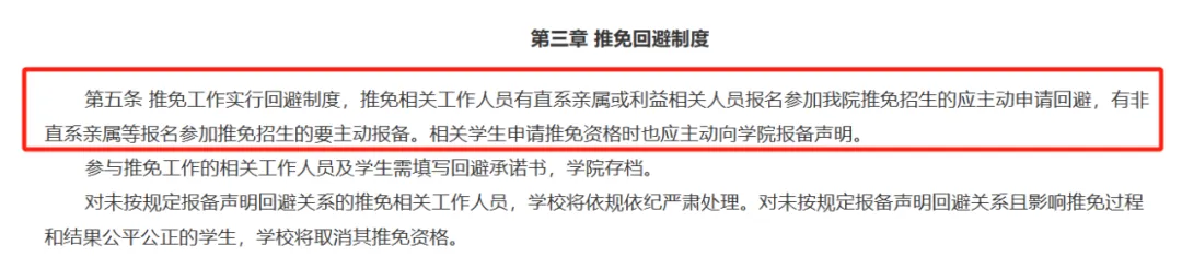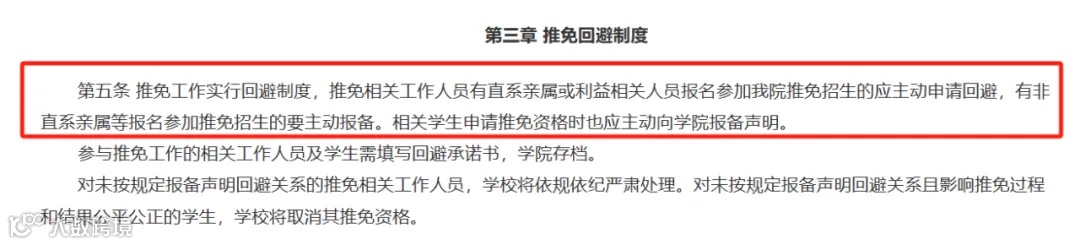 许多院校在推免工作中实行回避制度,要求“推免相关工作人员有直系亲属或利益相关人员报名参加我院推免招生的应主动申请回避”。