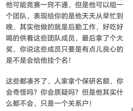 而作为负责人的关系户甚至不需要懂得项目,只需要组好团队,对接资源,就能成功斩获大奖,拿到保研的入场券且不会招到任何质疑。