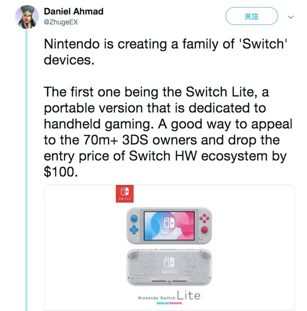 游戏分析师 Dainel Ahmad 在 Twitter 上表示,「任天堂正在打造一个 Switch 家族产品」,而 Switch Lite 则只是其中第一款。