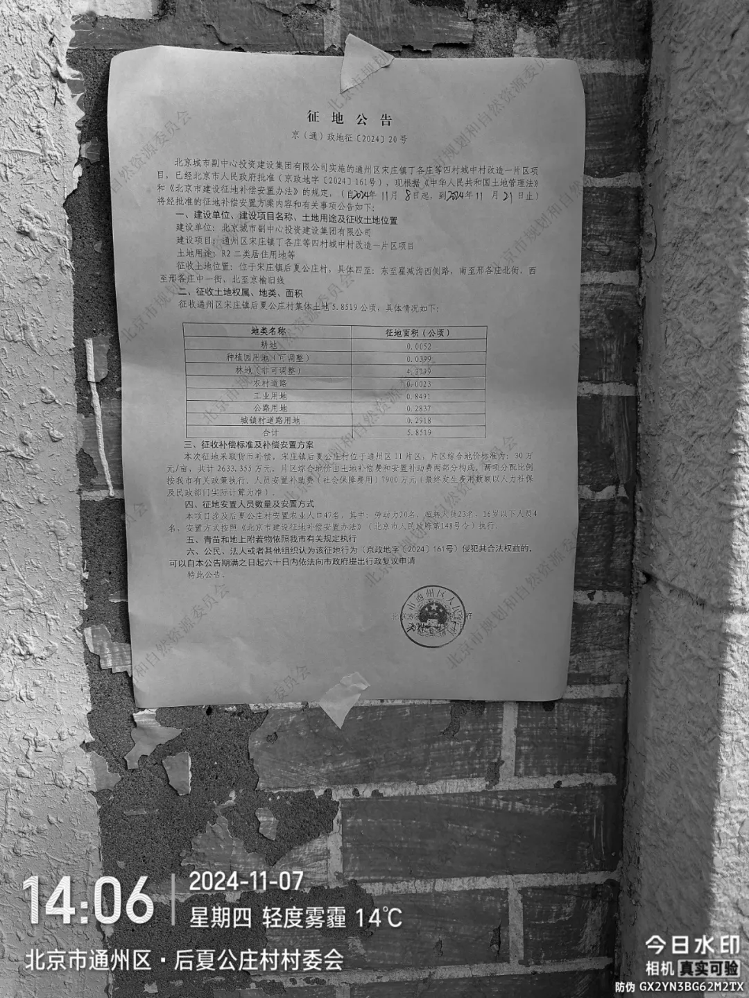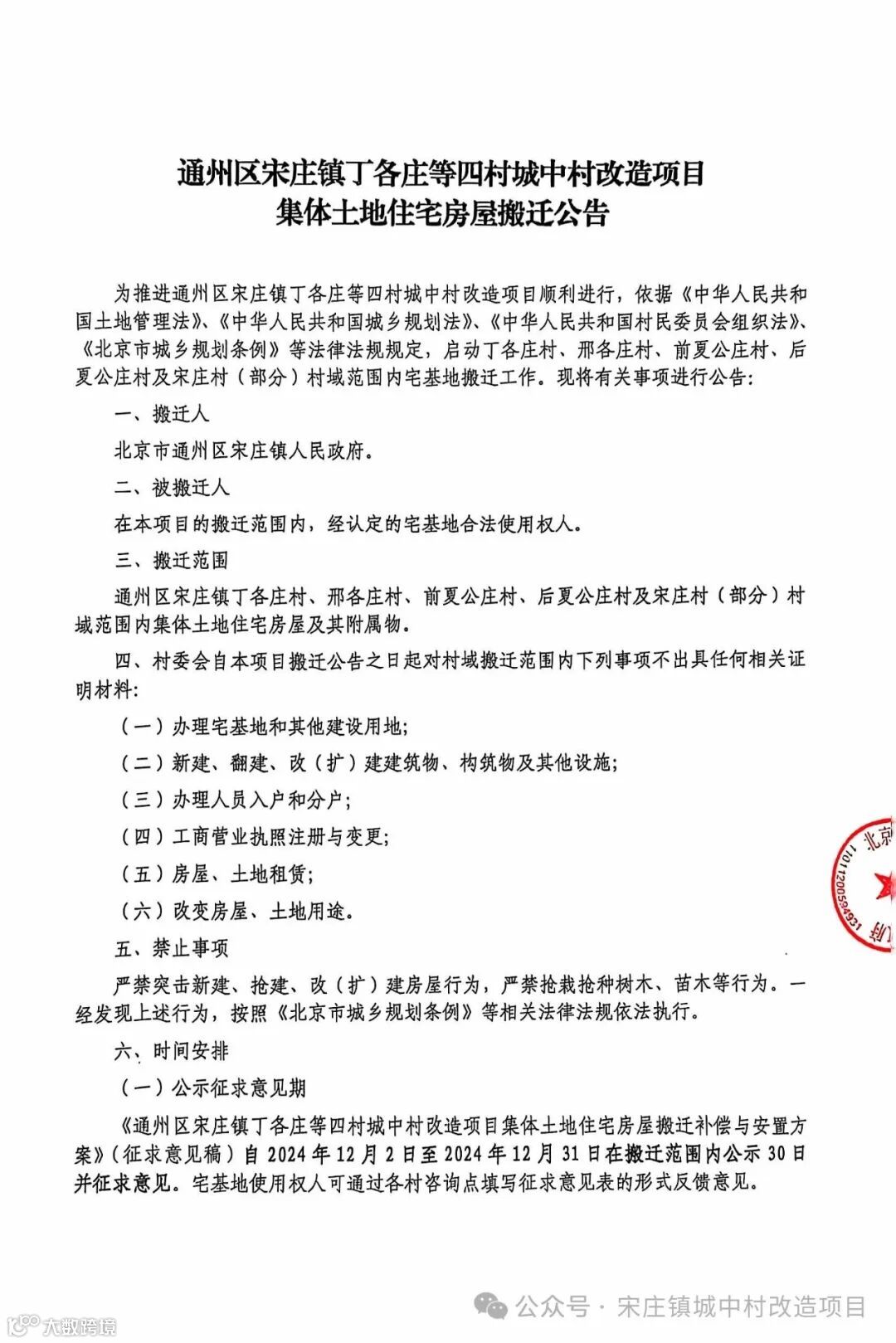 近日,通州区宋庄镇丁各庄等四村城中村改造项目集体土地住宅房屋搬迁公告,在各村公示栏进行了张贴公示,如您对政策有不理解的地方,请您到咨询点咨询工作人员。