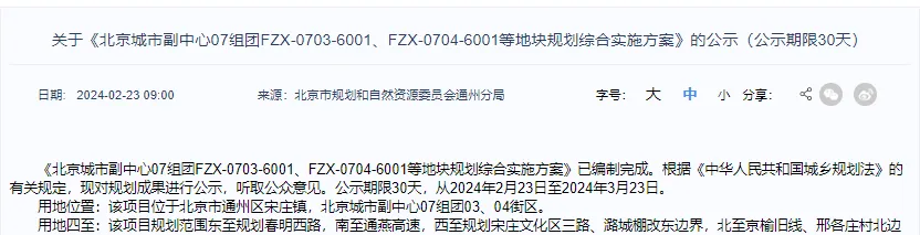 另据记者了解,该项目位置与发布的“关于《北京城市副中心07组团FZX-0703-6001、FZX-0704-6001等地块规划综合实施方案》的公示”位置大致重合,方案显示该项目位于北京市通州区宋庄镇,北京城市副中心07组团03、04街区。记者通过梳理发现,该方案在北京市十一学校通州实验学校仅隔一条马路的两个地块都规划有高中。从规划上看,这片区域从幼儿园到高中实现了“十二年一贯制”。