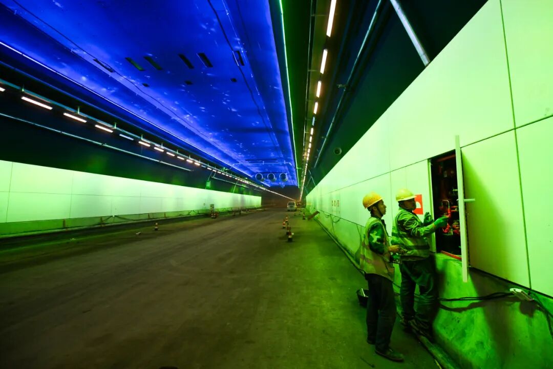 今年8月15日,在东六环改造工程地下隧道,施工人员进行隧道内设备安装工作。六环高线公园预计2028年底竣工