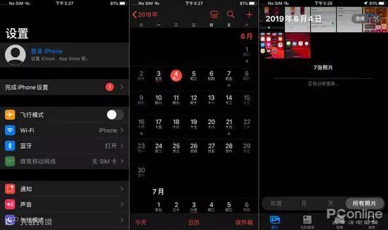 在正常的界面中,无论是黑暗模式或是非黑暗模式,其实没有特别大的变化,甚至连图标包都没有进行更换;在默认的壁纸中,唯一的变化就是背景的白色色块变成了黑色,除此之外别无二致。
